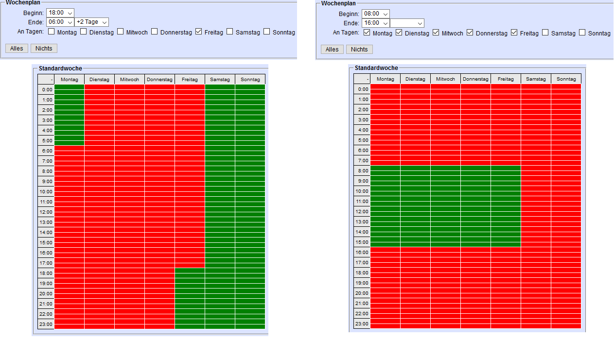 Wochenplan: Geben Sie Zeitfenster und Wochentage an, an denen der Plan gelten soll. Die ausgewählten Zeiten werden in der Grafik rechts grün angezeigt. Es ist nicht möglich, die Einsatzzeiten einzuzeichnen. Wählen Sie die Option „+ X Tage“ werden ab dem Starttermin die entsprechenden Tage dazugezählt. Im Folgenden zwei Beispiele: Im linken beginnt die Schicht Freitag, 17:00 Uhr und geht durchgängig bis Montag, 06:00 Uhr => 17.00 Uhr - 06.00 Uhr +2Tage. Das rechte Beispiel zeigt regelmässige Arbeitszeiten Montag bis Freitag, jeweils 08:00 - 16:00 Uhr.