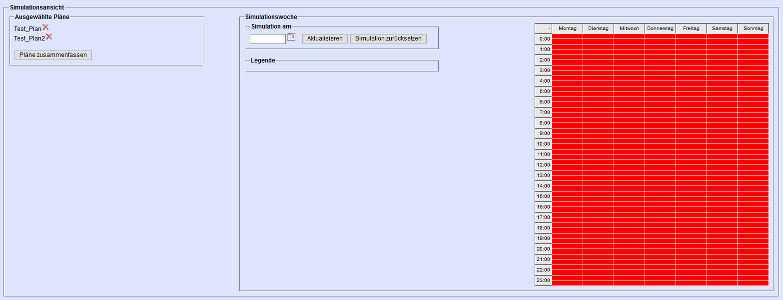 Um zu sehen, wie der Einsatzplan an einem bestimmten Datum aussehen wird oder wie sich mehrere Einsatzpläne überschneiden, steht die Simulationsansicht zur Verfügung. Wählen Sie dazu in der Liste Ihrer Einsatzpläne mithilfe der Checkbox die gewünschten Pläne aus. Unterhalb des Abschnitts „Neuen Plan erstellen“ öffnet sich nun der Abschnitt „Simulationsansicht“.