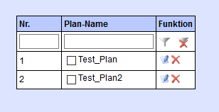 Im linken Bereich sehen Sie eine Liste Ihrer bereits erstellten Einsatzpläne. Sie können diese nach Nummer oder Plan-Name filtern, sowie einzelne Pläne bearbeiten