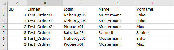 - LID und Name: Schlüssel und Name der zugehörigen Gruppen, siehe Gruppen. Der Name dient hier nur der besseren Lesbarkeit des Exports, beim Import wird dieser Wert ignoriert.
