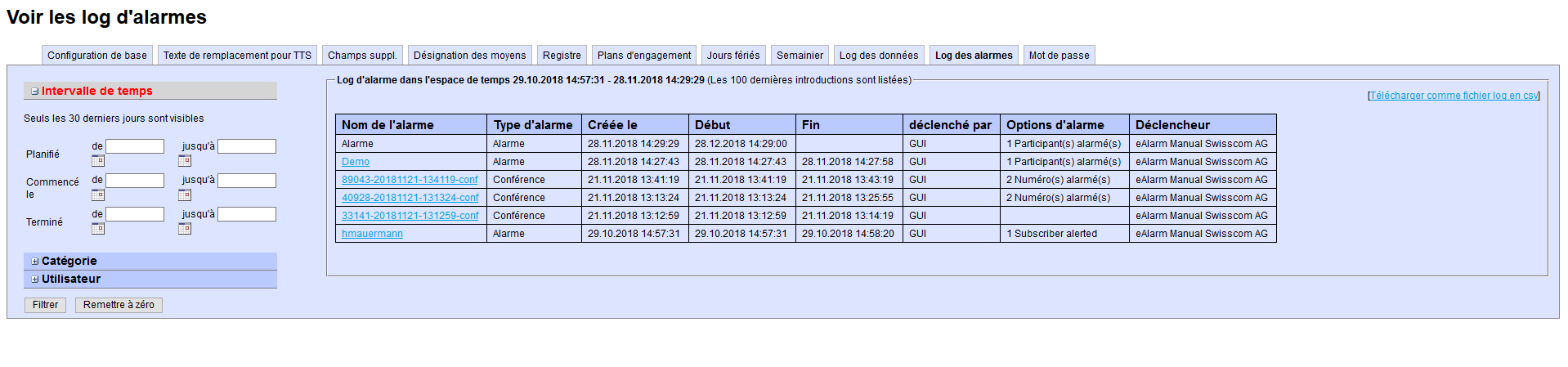 Le tableau montre quelle alarme a été déclenchée par quel type d’alarme (alarme, dispositif de conférence, etc.), à quel moment (créer, début, fin), comment («declénché par») et par qui («Déclencheur»).