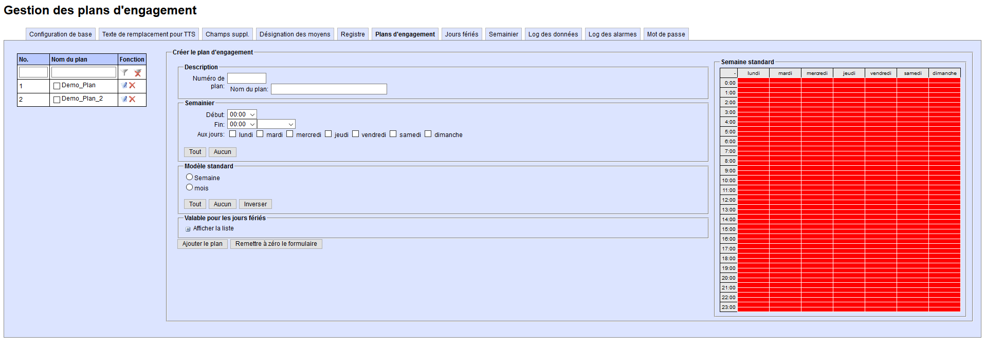 Le module optionnel «Plans d’engagement» vous permet de définir des créneaux d’intervention en tenant compte des horaires de jour et de nuit, des jours ouvrables et fériés, des semaines et des mois calendaires.