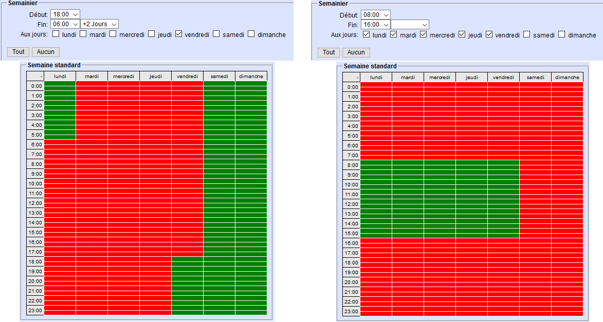 - Semainier: Indiquez la fenêtre temporelle et les jours de la semaine pendant lesquels le plan est valide. Les horaires choisis apparaissent en vert dans le graphique de droite. Il n’est pas possible de tracer les créneaux d’intervention. Sélectionnez l’option «+ X Jours» pour ajouter le nombre de jours souhaité à partir de la date de début. Voici deux exemples: Sur la gauche, le service commence le vendredi à 17:00 et se poursuit jusqu’au lundi à 06:00 => 17:00 - 06:00 Uhr +2Jours. L’exemple de droite illustre un service hebdomadaire régulier du lundi au vendredi entre 08:00 et 16:00.