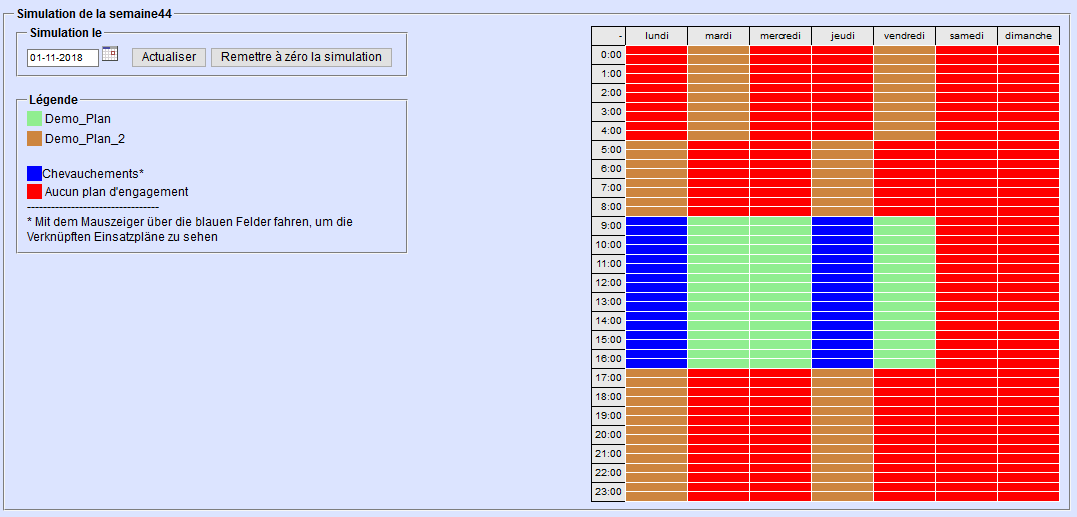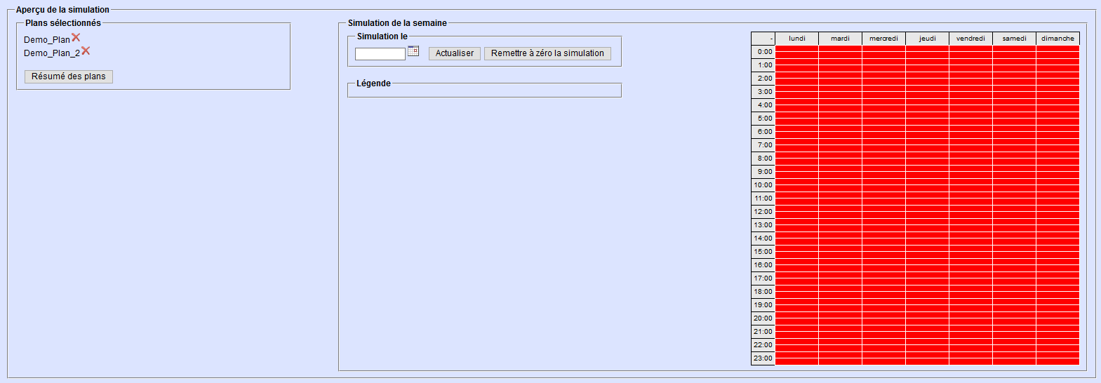Vous pouvez choisir de réunir les plans sélectionnés sur la gauche. Dans la zone «Simulation de la semaine», choisissez une date pour visualiser l’apparence du plan d’intervention sur la semaine correspondante.