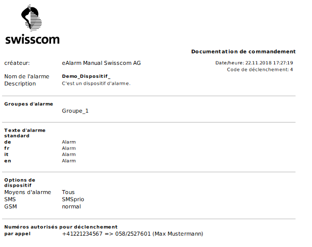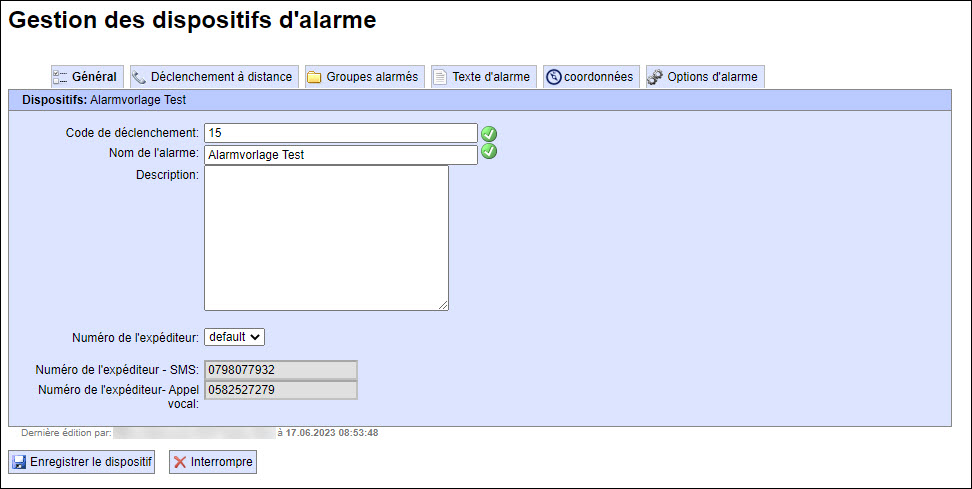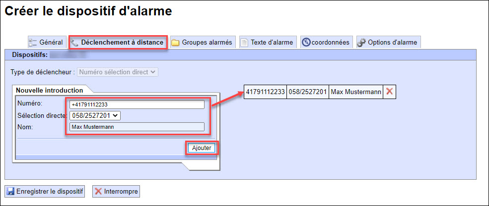 Une fois le dispositif créé, vous pouvez modifier la fonction «autorisé pour déclenchement» (module optionnel). Définissez les noms et numéros des personnes autorisées à déclencher le dispositif d’alarme par sélection directe auszulösen.