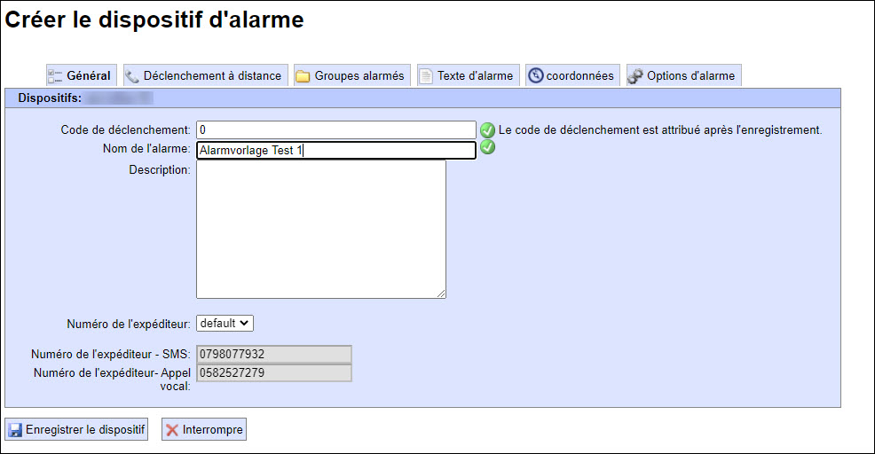 Définissez ici les détails de l’alarme. Pour terminer, enregistrez votre dispositif d’alarme en cliquant sur le bouton “Enregistrer le dispositif”.