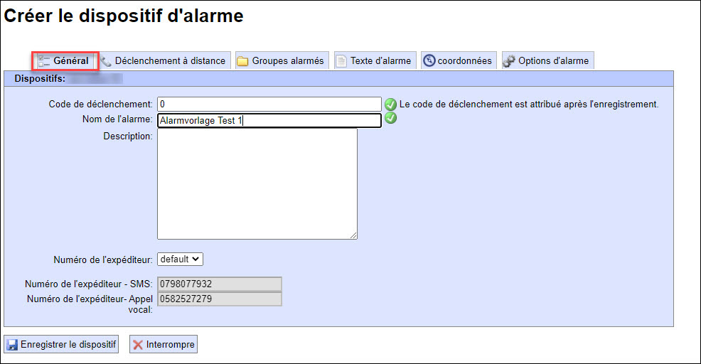 Dans l’onglet «Général», définissez le code de déclenchement et le nom de l’alarme; vous pouvez également rédiger une description de l’alarme.