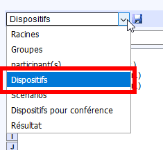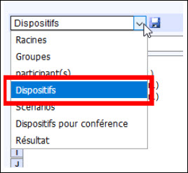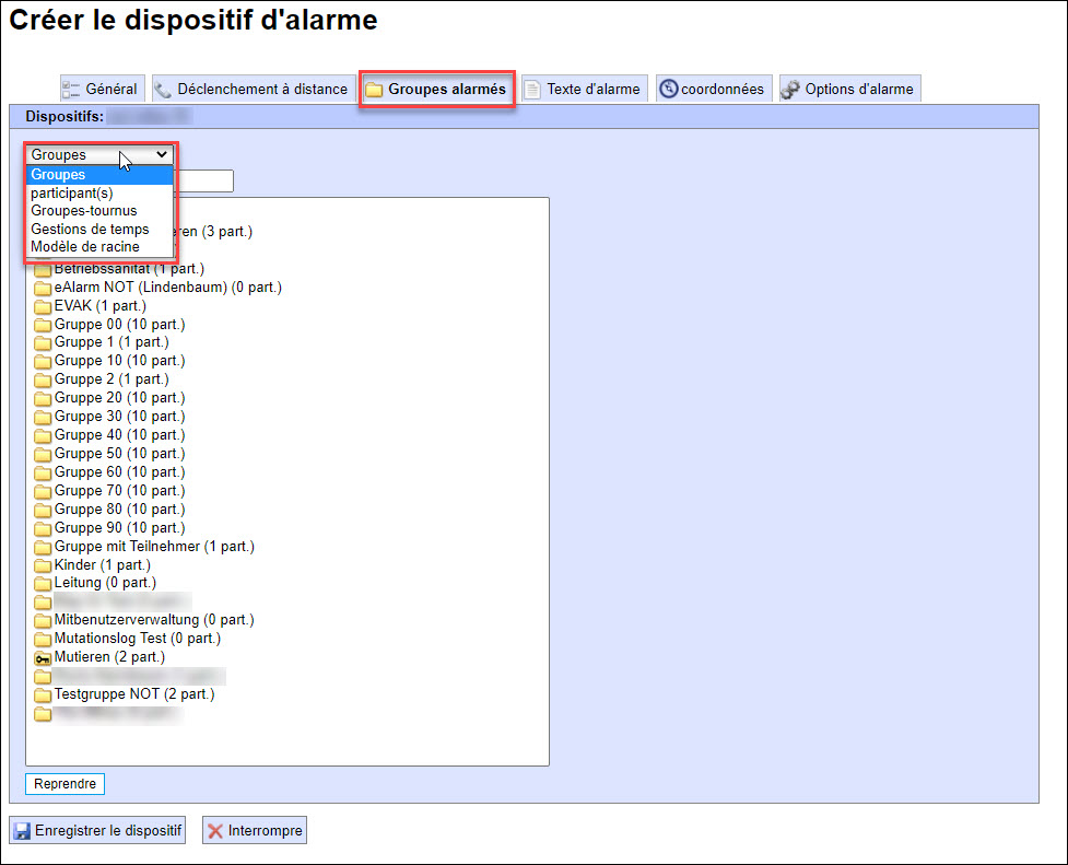 Dans l’onglet “Groupes alarmés”, le menu déroulant permet de sélectionner les unités telles que Groupes, Participants(s), Groupes-tournus (en option), Contrôles Gestions de temps (en option) ou Modèle de racîne entières qui doivent être r