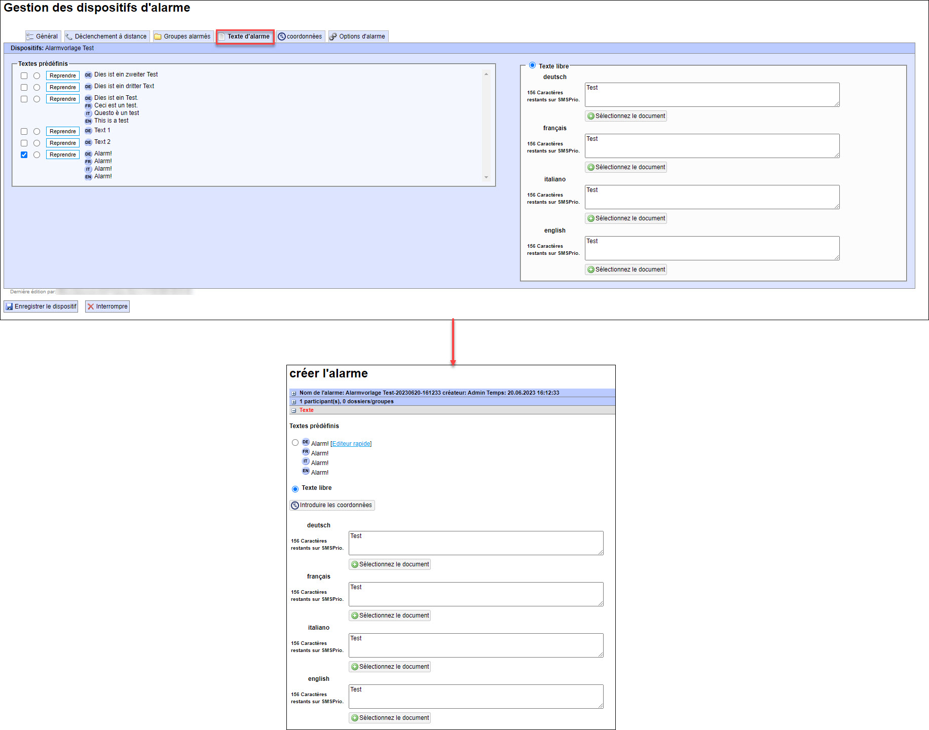Dans la capture d’écran suivante par exemple, le texte libre «Alarm» est défini comme texte par défaut, tandis que le texte d’alarme prédéfini «Ceci est une alarme» est défini comme texte alternatif. Si le dispositif d’alarme est déclenché, les textes sélectionnés apparaîtront dans le menu «Text», avec le texte par défaut (dans ce cas, le texte «Alarm») présélectionné.