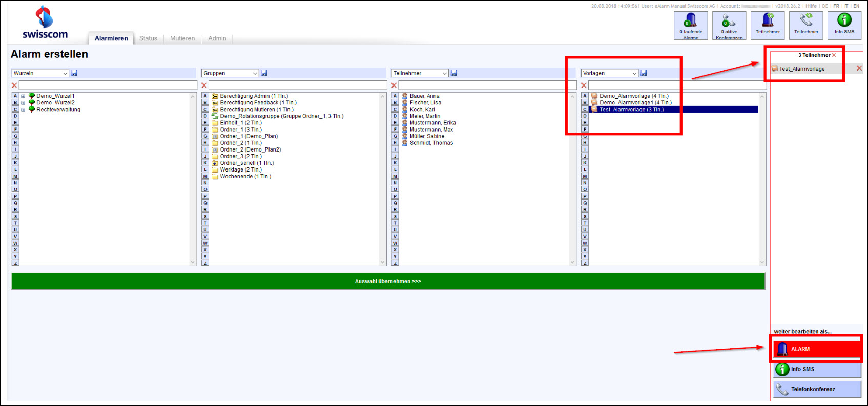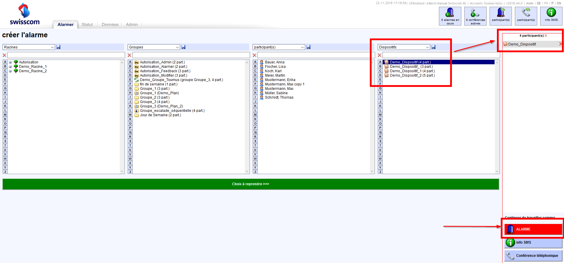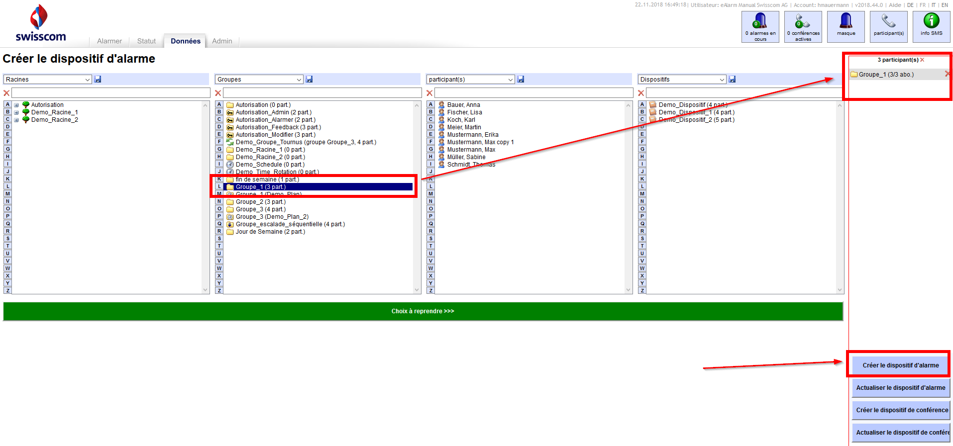 Il est également possible d’ajouter des groupes à un dispositif d’alarme après sa création. Pour cela, sélectionnez le groupe de votre choix dans l’onglet «Alarme», puis ajoutez-le à la colonne «participants», sur le côté droit, par glisser-déposer, par double-clic ou en cliquant sur le bouton «Choix à reprendre». Passez ensuite dans l’onglet «Données» et cliquez sur le bouton «Actualiser le dispositif d’alarme» dans le menu «Liste des participants».