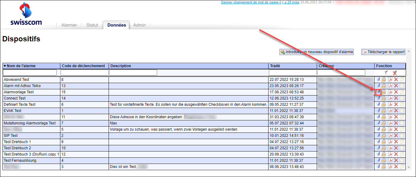 pour modifier un dispositif d’alarme. Plus d’informations dans la section Créer un dispositif d’alarme. -