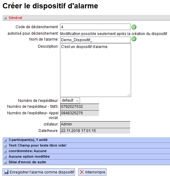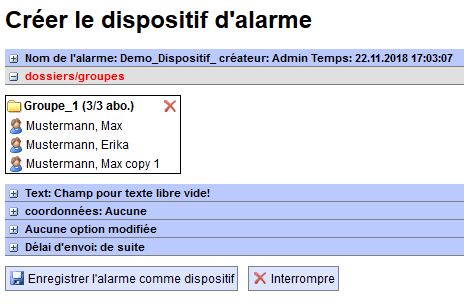 Le menu «Créer le dispositif d’alarme» s’affiche avec toutes les options. Comme le décrit le paragraphe Créer une alarme, vous pouvez définir ici les informations détaillées de l’alarme. Pour tout enregistrer, cliquez ensuite sur le bouton «Enregistrer l’alarme comme dispositif».