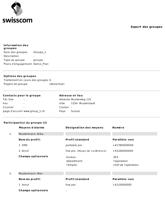 : pour créer un rapport PDF qui contient également un export des différents participants, ainsi que de leurs moyens d’alarme, profils et champs optionnels.