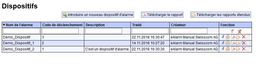 . Si vous avez par exemple filtré les dispositifs d’alarme pour afficher uniquement ceux créés le 1er janvier 2018, vous pouvez créer un rapport répertoriant ces derniers en cliquant sur «Télécharger report».